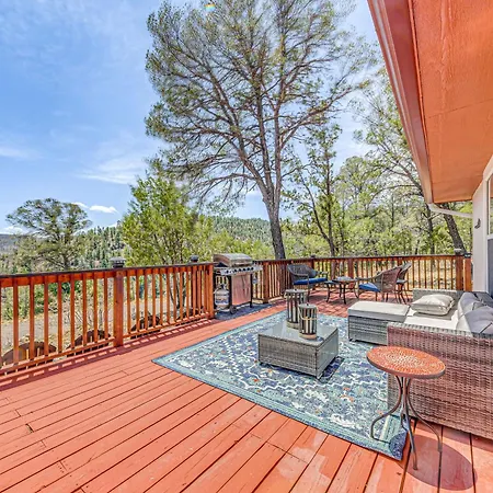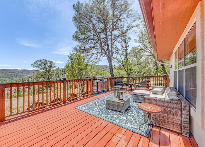 Charming Ruidoso House With Deck And Mountain Views! Villa features ironing facilities and climate control, high-speed internet and a television, as well as overlooks the mountain. The property comes with a bathroom with a bathtub, a separate toilet, and a shower. There are a hairdryer, toiletries, and bath sheets for guests' comfort.